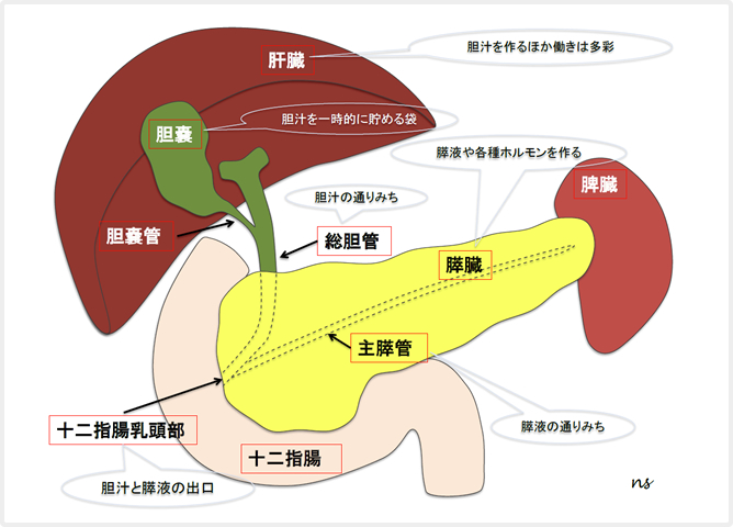 肝臓の働きの一つに胆汁を作る、という機能があります。胆汁には脂肪の消化を助ける働きがありますが、作られた胆汁は肝内に網の目のように張り巡らされている胆管に分泌され、最終的に総胆管に集められ十二指腸乳頭部から十二指腸に分泌されます。胆嚢は胆汁を一時的に貯めておく“袋”で胆嚢管を介して総胆管と繋がっています(図)。
